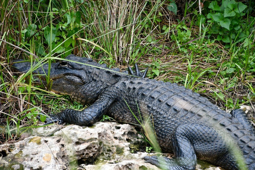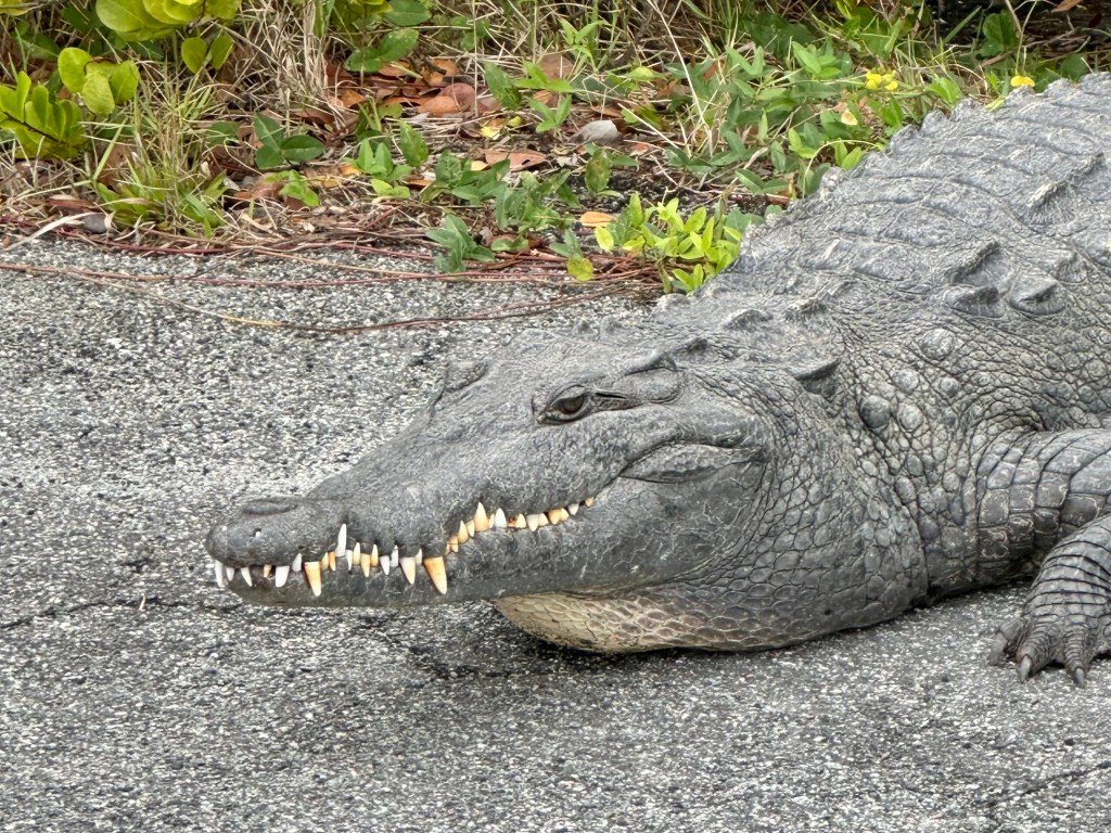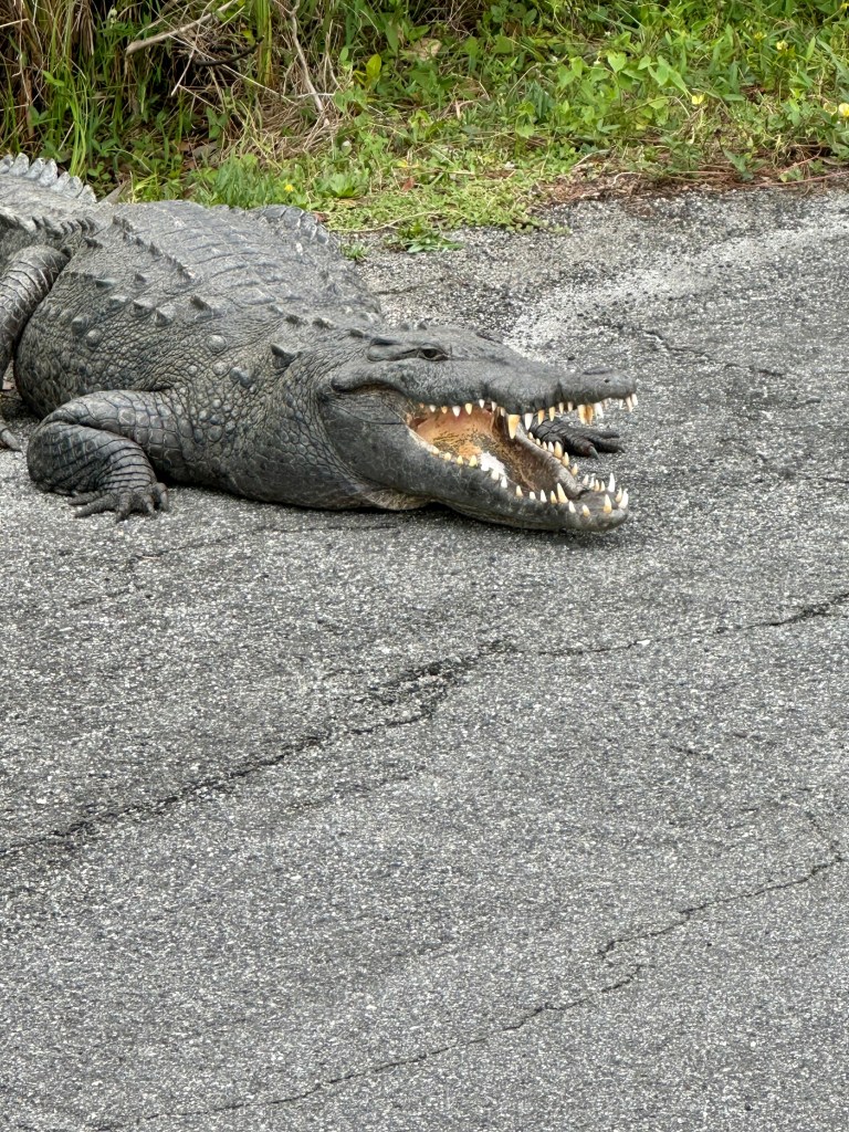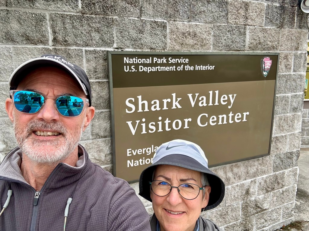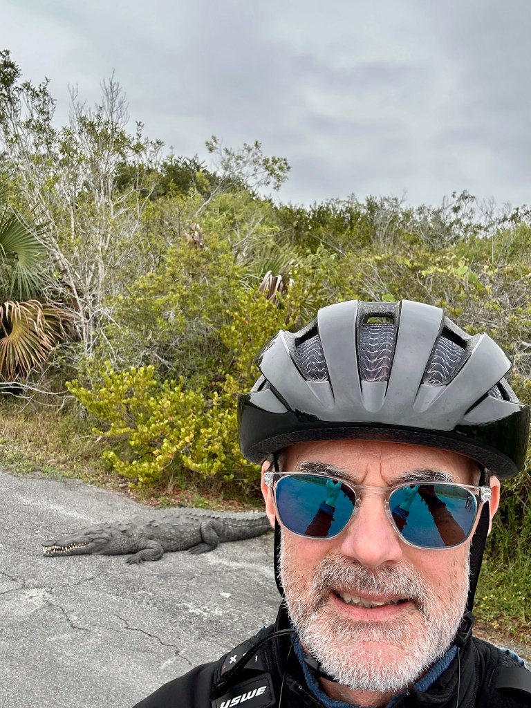 We decided to bike Shark Valley Trail at the National Park. It felt safer to me than walking next to the alligators. Mark actually rode out farther than I did and had his own intimate moment with an alligator (see pictures below) before riding back to meet me. We saw a Purple Gallinule for the first time. And so many Great Blue Herons and alligators that I didn’t stop to photograph them all. The ride out was easy. Piece o’ cake, I thought. And then we turned around. The headwind was formidable. I could barely go a mile at a time without a rest.