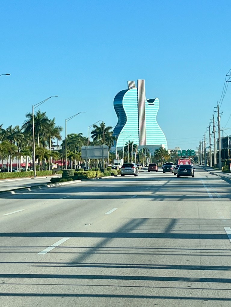 We arrived at our campground in Hollywood, Florida, around suppertime. It was one of the worst campgrounds we’ve stayed in. It felt like we were in a small neighborhood. The sites were small. The first site they gave us was next to an oversized rig whose awning stuck out into our site. We’d have hit it if we backed in. The second site was smaller and closer to the tiny bathrooms. And we had a perfect view of the trash dumpsters out our front window. The only redeeming sight in Hollywood was the impressive Hard Rock Cafe Hotel built in the shape of a guitar.