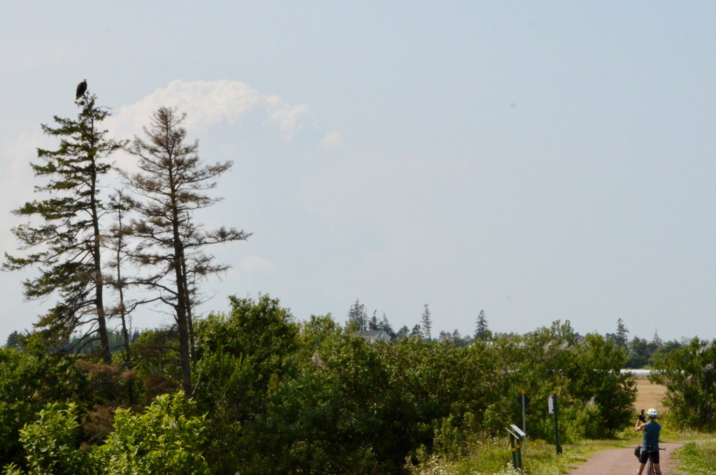 We found a bike trail in Morrell and spent the morning biking from there to St. Peter’s — about a seven mile trip. We stopped for lunch and then biked back. Such beautiful, peaceful scenery! And a surprise bird encounter along the way. (I should also mention a few other surprise encounters: several other Massachusetts residents spending time on the bike trail that day.)